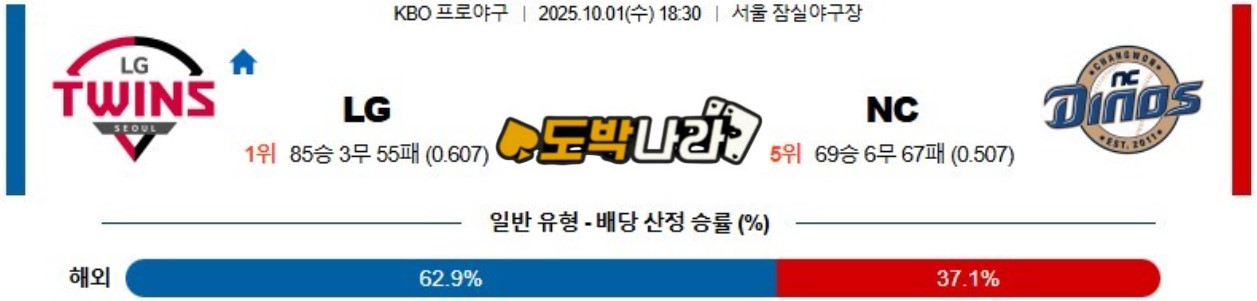 LG가 위험해지고 있다. 매직넘버 1을 2경기 연속으로 지우지 못하고 있는 중. 하지만 어빈과 김태경의 차이는 솔직히 대단히 큰 편이고 홈에서 치리노스는 충분히 호투를 기대할수 있는 레벨. 물론 전날 불펜이 공략당하긴 했으나 NC의 타선은 홈에 비해 원정의 타격이 조금 아쉽고 무엇보다 김태경은 믿기 어렵고 NC 불펜의 소모도 크다. 전력에서 앞선 LG가 승리를 가져갈 것이다.