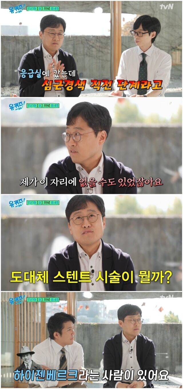 이에 유재석이 “바로 괜찮아지셨냐”고 묻자, 김 교수는 “중환자실에 누워 있는데 ‘도대체 스텐트 시술이 뭘까?’ 궁금했다”고 답했다.